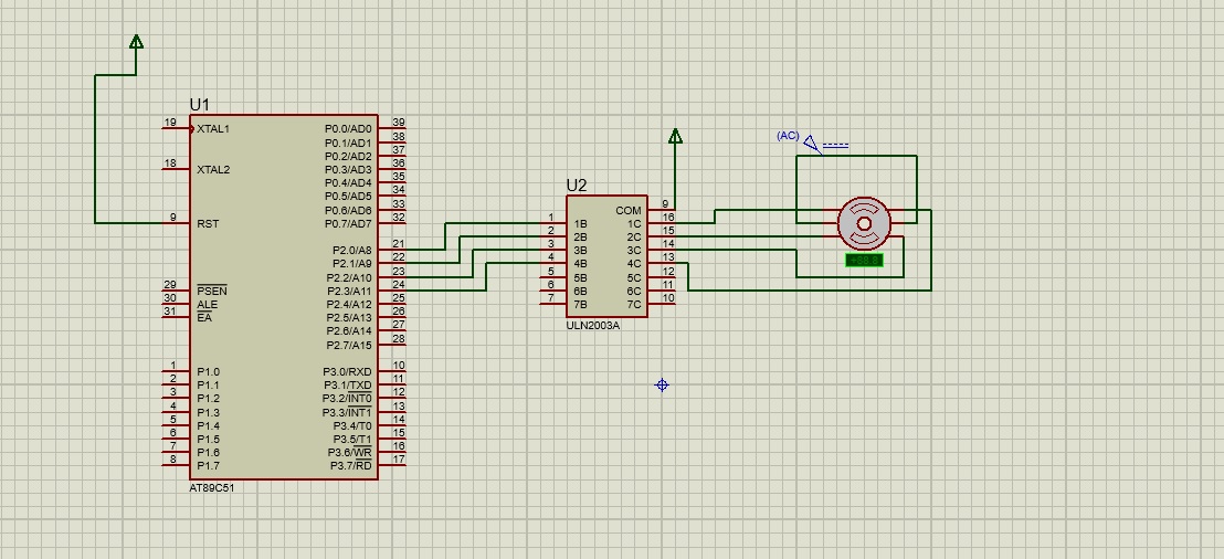 There are two types of stepper motor, Unipolar and Bipolor. Unipolar stepper motor generally has five or six wire, in which four wires are one end of four stator coils, and other end of the all four coils is tied together which represents fifth wire, this is called common wire (common point). Unipolor stepper motor has three modes of driving, Wave drive mode, full step drive mode and half step drive mode. In this project we rotate in full wave drive mode, by giving intruction in c code . we made a C code of anti-clockwise and clockwise of a stepper motor and burn into a AT89S51 microcontroller by using development board, and then we connect the wires according to proteus simultion. There is one changing in simulation we use in hardware stepper motor driver circuit instead of simple ULN2003 IC. Note: To run the project connect the EA (pin no: 31) of microcontroller to the Vcc. (REFERENCE = www.circuitdigest.com)