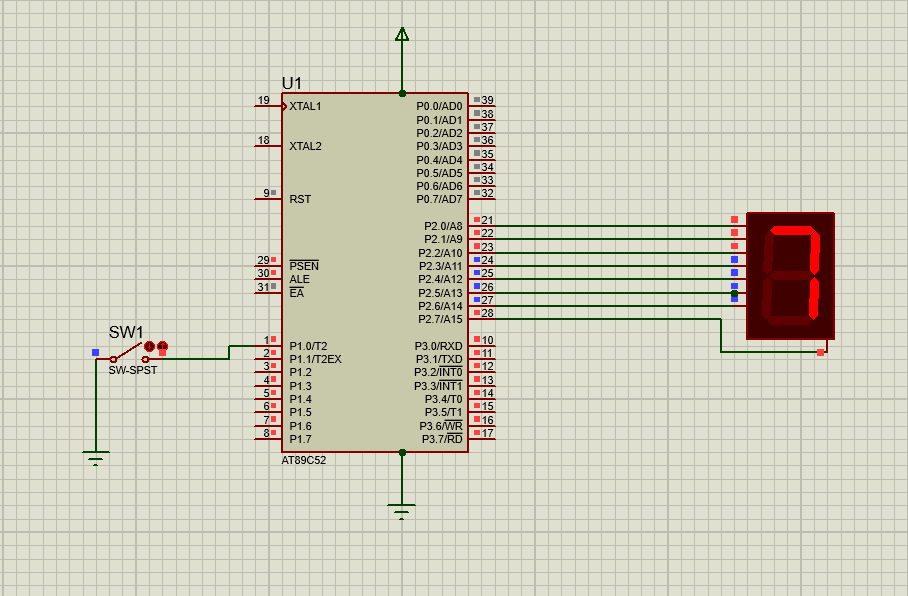 Down counter with seven segment display using 8051 ic. This counter counts down from '9-0' when we press the button.